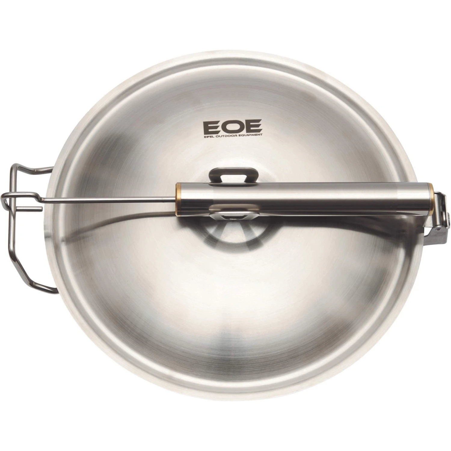 Die Pann von EOE ist der Wok für unterwegs. Die großvolumige Pfanne ist aus massivem Edelstahl gefertigt und kann so auch in die Glut gestellt werden. Durch den einklappbaren Griff kann die Pfanne platzsparend verstaut werden. Nach dem ausklappen des Griffs (dazu einfach am Haken ziehen um den Griff zu lösen) wird dieser mittels Schraubverbindung (integriert) fixiert. Die Pann kann auf allen Arten von Kochstellen verwendet werden, auch auf Induktionskochfeldern.