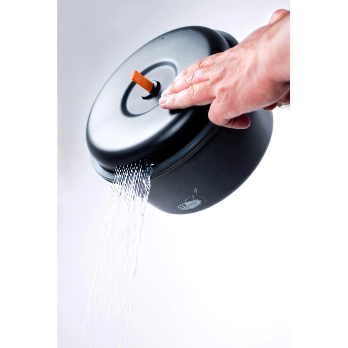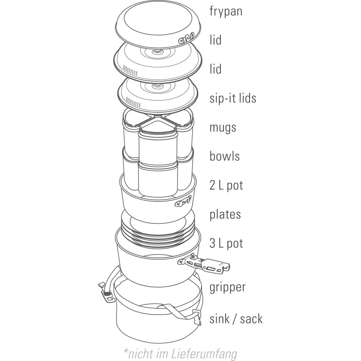 Umfangreiches Aluminium Kochset, welches höchsten Ansprüchen gerecht wird. Die perfekte Beschichtung der Töpfe verhindert ein Verkratzen und ermöglicht komfortables Kochen – fast wie zu Hause. Das Set ist sehr umfangreich ausgestattet und dennoch extrem leicht und platzsparend. Ideal für längere Touren mit mehreren Personen und ideal auch für Caravan, Wohnmobil oder Expedition. Bestehend aus 2 Töpfen, den passenden Deckeln mit Abseihfunktion dazu, einer Pfanne mit abgedrehtem Boden für guten Stand auf dem Kocher, vier Kunststofftellern und den farblich passenden Tassen und Schüsseln. Tassen jeweils mit isolierendem Neoprenmantel und Durchtrink-Deckel, nestbar in den Schüsseln. Die klappbare, stabile Griffzange sowie die Transporttasche, die auch als Waschschüssel benutzbar ist, runden dieses durchdachte und perfekte Set ab.