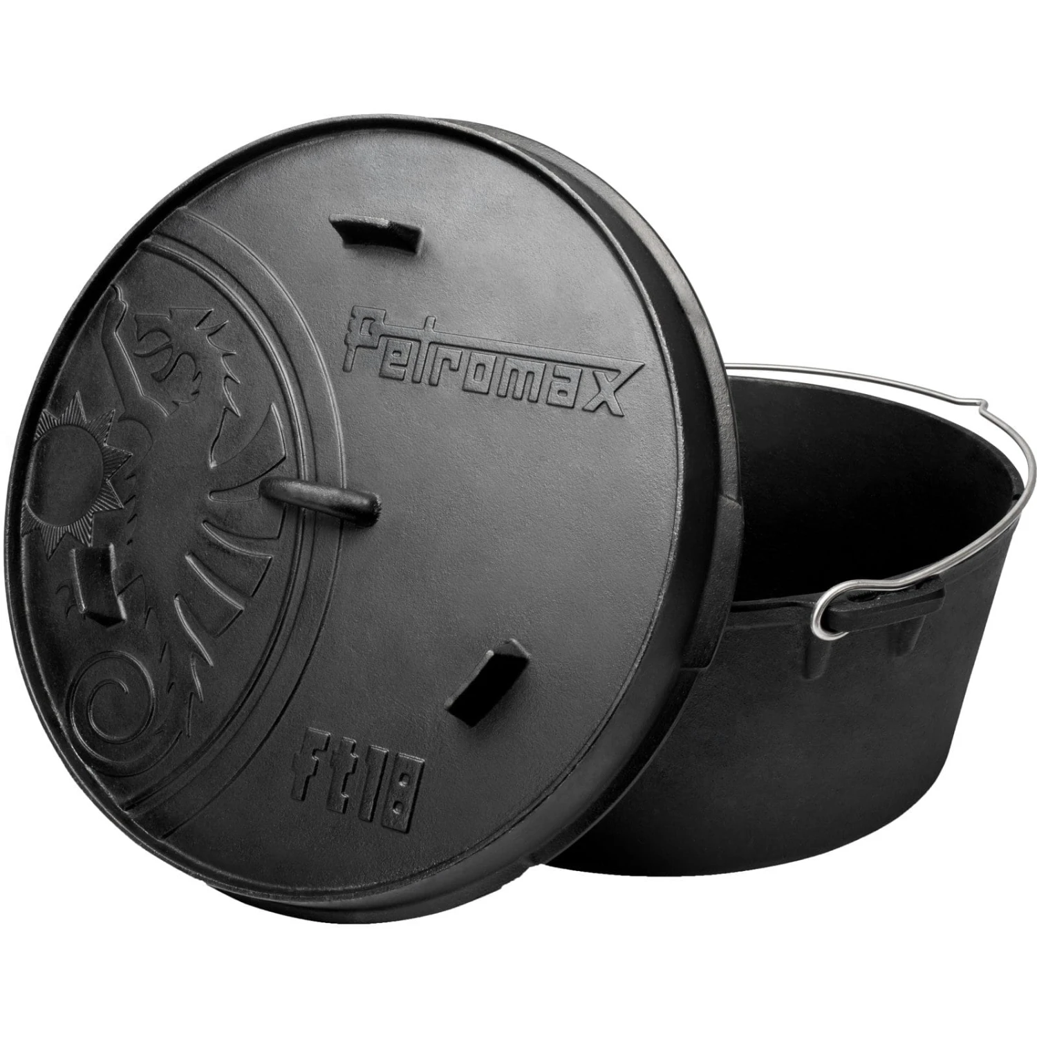 Er ist schwarz und er ist robust! Der Feuertopf ft18-t ohne Füße von Petromax ist ein vollständig aus Gusseisen gefertigter Topf von exzellenter Qualität. Weitläufig auch als Dutch Oven bezeichnet, ist der Petromax Feuertopf ideal für das Kochen im Freien und im heimischen Backofen geeignet. Die exzellente Wärmeleitung und die Speicherung der Wärme über einen langen Zeitraum sowie die extreme Robustheit zeichnen den Topf aus. Der ideale Begleiter für Ihre Camping-, Outdoor- und Freizeitaktivitäten. Mit ihm garen Sie Speisen, wie z. B. Fleisch und Gemüse, sehr schonend im eigenen Saft über offenem Feuer oder im Backofen. Der Deckel des Feuertopfs kann zudem optional als Servierplatte oder Pfanne genutzt werden. Dank der vorbehandelten Oberfläche (seasoned finished) können Sie den robusten Petromax Feuertopf ft18-t aus Gusseisen sofort einsetzen. Der ft18-t hat an der Unterseite keine Füße, der Deckel aber nach wie vor.