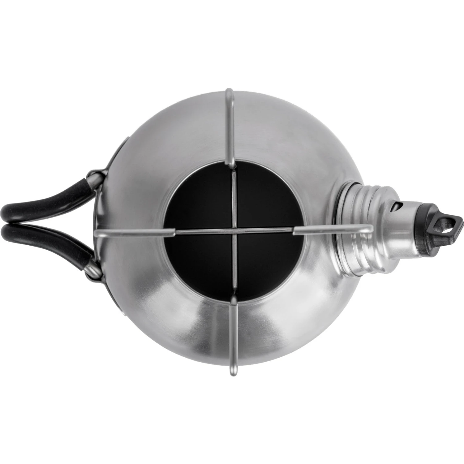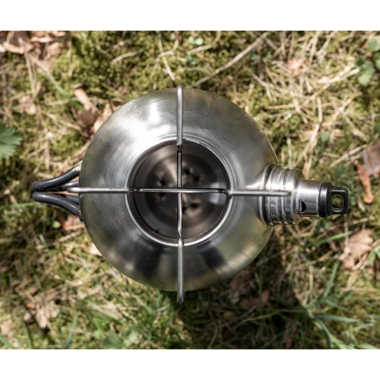 Die Feuerkanne fk-le150 von Petromax besteht aus Edelstahl, sie ist ein autarker Wasser- oder Notfallkocher und bereichert die Outdoorküche. Mit kleinen Ästen, Zweigen oder Tannenzapfen lässt sich die Wasserkanne einfach und in kurzer Zeit befeuern. Das Brennmaterial wird in der Feuerschale entzündet und die Wärme steigt im Hohlraum der Kanne auf. Durch den entstehenden Kamineffekt wird das sich in der Doppelwand befindende Wasser erhitzt und in wenigen Minuten zum Kochen gebracht. Mit einem kräftigen Ton signalisiert die Dampfpfeife, dass das Wasser den Siedepunkt erreicht hat. Der zusätzliche Schraubdeckel sorgt für einen auslaufsicheren Wassertransport und die Feuerschale mit Füßen verleiht der Kanne jederzeit festen Stand. Die Feuerschale inklusive Füße kann zum Transport und zur Lagerung passgenau in der Bodenöffnung der Feuerkanne verstaut werden. Dank der Silikongriffe ist das Entfernen von der Hitzequelle problemlos möglich. Neben Wasser heizt die fk-le150 auch dem Kochgeschirr ein und dient somit als Campingkocher. Der in der Kannenöffnung fixierbare Kochaufsatz bietet Platz für kleine Töpfe und Kessel. Die an der oberen Öffnung entweichende Wärme kann dabei genutzt werden, um kleine Mahlzeiten zu erhitzen.