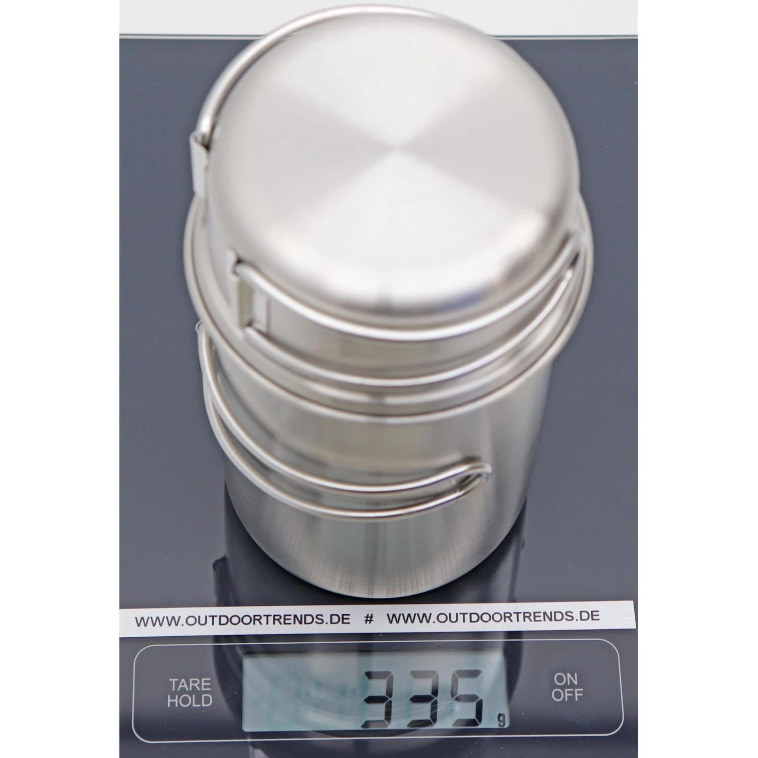 Das Handle Mug 850 Set von Tatonka besteht aus dem bekannten und bliebten Handle Mug 850 (mit Maßskala innen) sowie dem Handle Mug Lid. Wie gewohnt passt in beides eine Liter Weithalsflasche von Nalgene und zusammen genommen hat man 1.100 ml Volumen. Neben der Möglichkeit diese Kombinatin als Tasse, Becher oder Schüssel zu nutzen eignen sie sich auch um damit Speisen zu erwärmen. Gefertigt aus reinem Edelstahl ist das Tatonka Handle Mug 850 Set geschmackneutral, extra langlebig und hat die beliebten Klappgriffe.